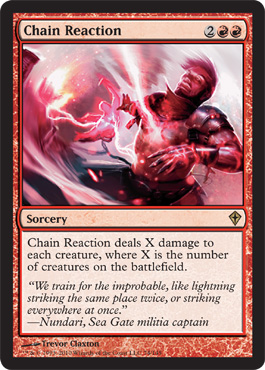 Now here’s Red’s Wrath. You can put your own tokens down to keep pumping this up, but if you’re playing in a group game, this suddenly gets better and better. Because it does damage, it won’t get rid of those “Protection from Red” creatures, but unlike Earthquake, it can and will hit flyers. It’s not a finisher by any means, but it’s a great way to keep the board clear of creatures.