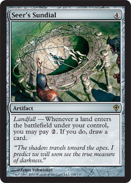 Cool point about the Zendikon’s ability to protect your own lands. I might use Guardian Zendikon to protect Emeria in my Konda deck. Possibly Terra Eternal too, but sometimes I want to get rid of my opponent’s problem lands. Also going to put Seer’s Sundial in my (non-blue) monocolored decks. An upgrade from Candles of Leng as a way to draw cards!